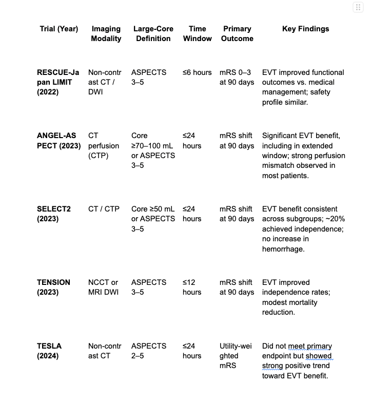 Across six randomized trials, five demonstrated significant benefit of EVT in patients with large-core infarcts, while one (TESLA) showed a positive trend that did not meet its primary endpoint. Collectively, these findings indicate that EVT can provide meaningful benefit even in patients with large-core infarcts, though outcomes remain poorer than in small-core cohorts. Importantly, benefits extended into the late treatment window (up to 24 hours) in SELECT2 and ANGEL-ASPECT, and safety signals were reassuring across all studies, with no significant increase in symptomatic intracranial hemorrhage.